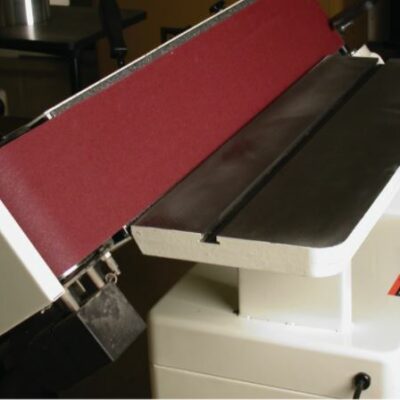 Onze schuurmachine is een oscillerende bandschuurmachine. Daar de opwaartse beweging krijg je steeds een mooi egaal schuurvlak zonder brandvlekken. Hiermee kan je randen of vlakken volledig afschuren. Door de beschermkap aan de zijkant weg te nemen, kan je ook hollingen bijschuren.